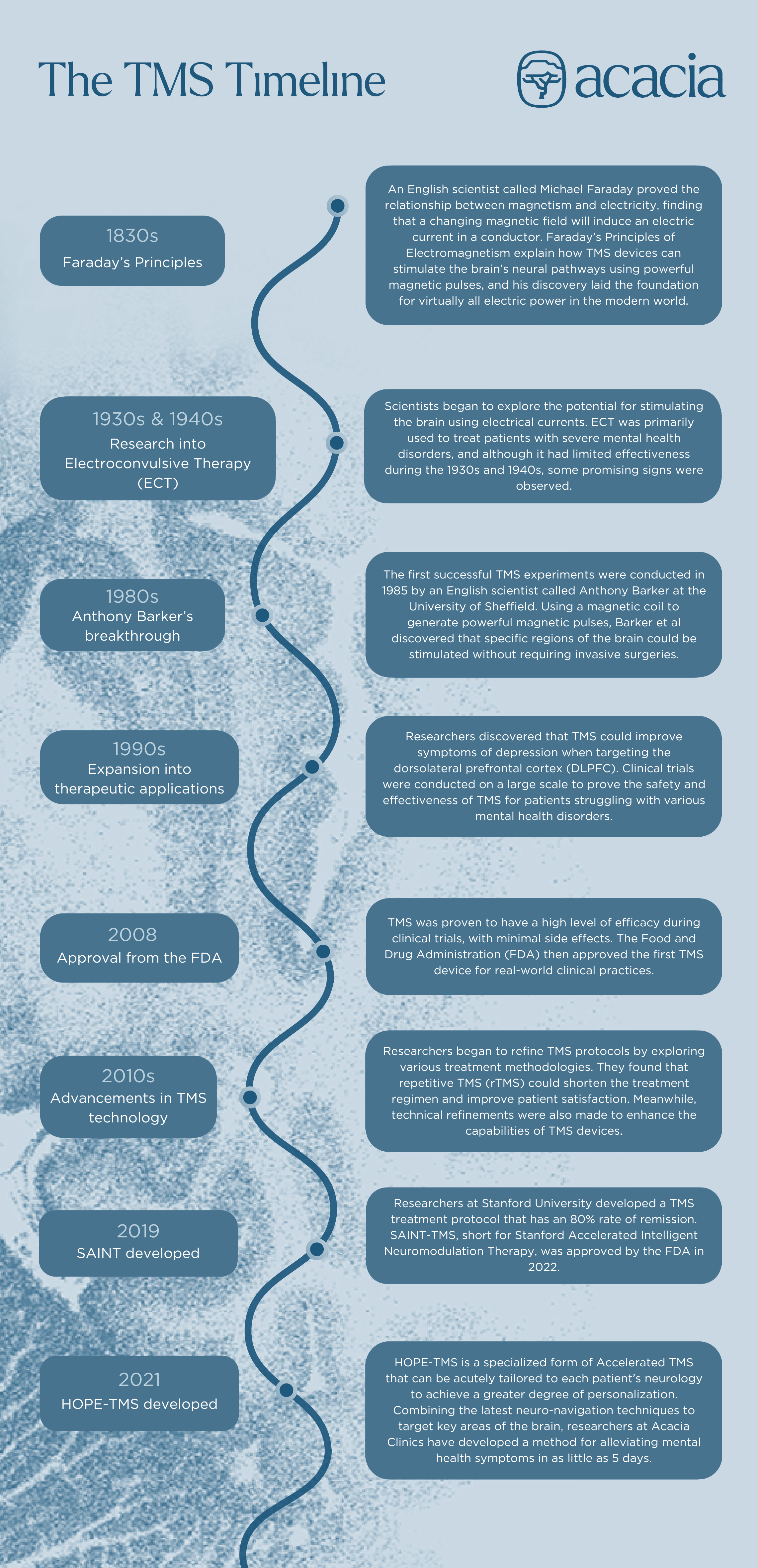 Breakthrough discoveries from key figures such as Michael Faraday and Anthony Barker encouraged scientific researchers to explore the efficacy of electromagnetism for a variety of therapeutic applications, which laid the foundation for TMS as we know it today.